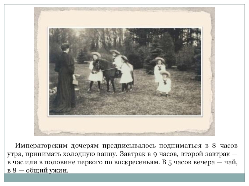 Слайд 8Императорским дочерям предписывалось подниматься в 8 часов утра, принимать холодную ванну.