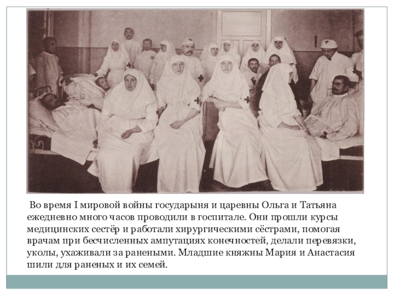 Татьяна ежедневно много часов проводили в госпитале. Они прошли курсы медицинских сестёр и работали хирургическими сёстрами, помогая врачам при бесчисленных ампутациях конечностей, делали перевязки, уколы, ухаживали за ранеными. Младшие княжны Мария и Анастасия шили для раненых и их семей.