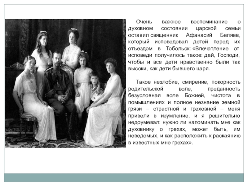 Слайд 2Очень важное воспоминание о духовном состоянии царской семьи оставил священник Афанасий Беляев,
