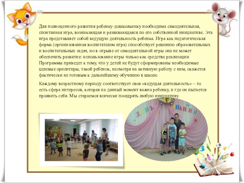 Каждому возрастному периоду соответствует своя «ведущая деятельность» – то есть сфера интересов, которая на данный момент важна ребенку, и где он пытается проявить себя. Мы стараемся всячески поощрять любую инициативу.