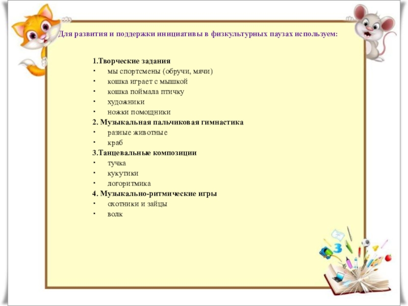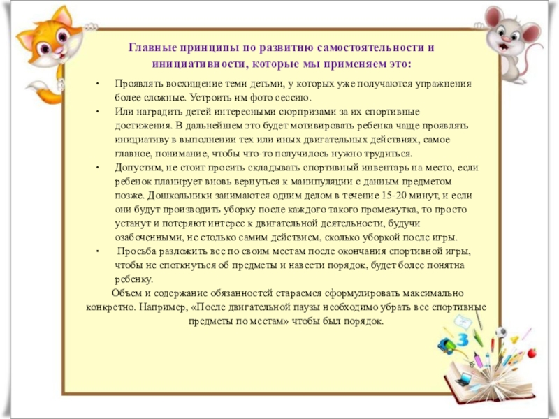 Объем и содержание обязанностей стараемся сформулировать максимально конкретно. Например, «После двигательной паузы необходимо убрать все спортивные предметы по местам» чтобы был порядок.