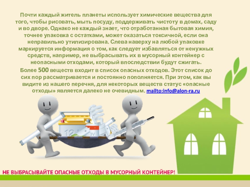 мыть посуду, поддерживать чистоту в домах, саду и во дворе. Однако не каждый знает, что отработанная бытовая химия, точнее упаковка с остатками, может оказаться токсичной, если она неправильно утилизирована. Слева наверху на любой упаковке маркируется информация о том, как следует избавляться от ненужных средств, например, не выбрасывать их в мусорный контейнер с неопасными отходами, который впоследствии будут сжигать.