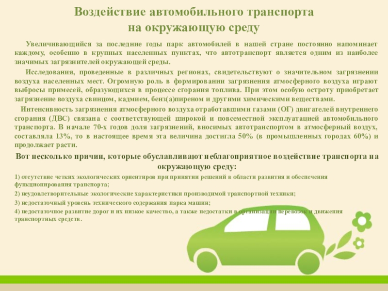 Вот несколько причин, которые обуславливают неблагоприятное воздействие транспорта на окружающую среду: