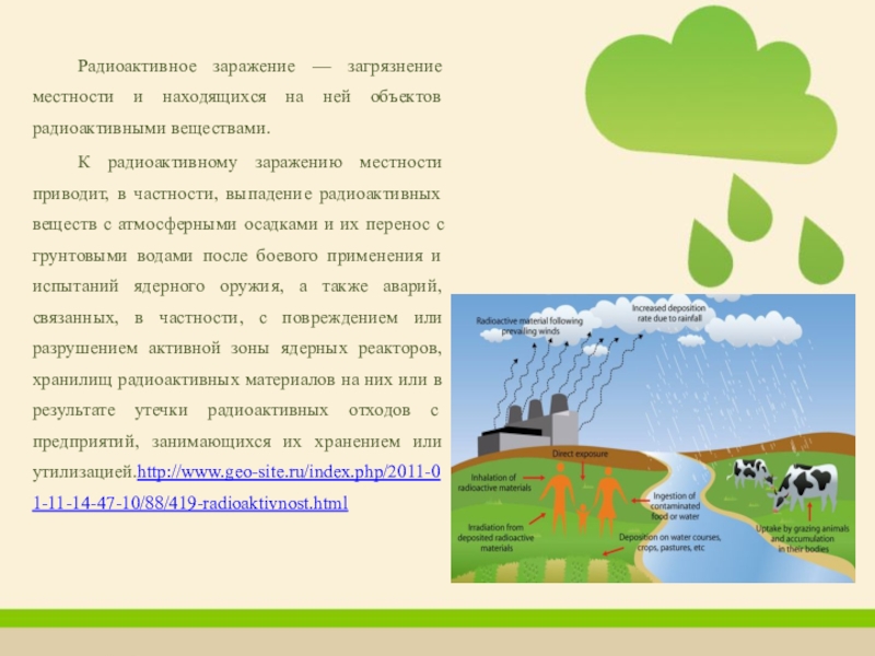 К радиоактивному заражению местности приводит, в частности, выпадение радиоактивных веществ с атмосферными осадками и их перенос с грунтовыми водами после боевого применения и испытаний ядерного оружия, а также аварий, связанных, в частности, с повреждением или разрушением активной зоны ядерных реакторов, хранилищ радиоактивных материалов на них или в результате утечки радиоактивных отходов с предприятий, занимающихся их хранением или утилизацией.http://www.geo-site.ru/index.php/2011-01-11-14-47-10/88/419-radioaktivnost.html