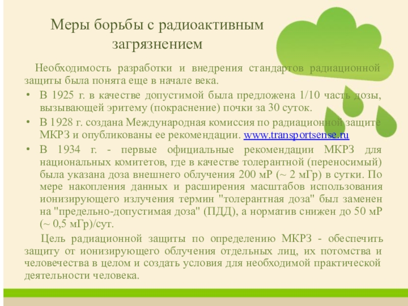 В 1928 г. создана Международная комиссия по радиационной защите МКРЗ и опубликованы ее рекомендации. www.transportsense.ru