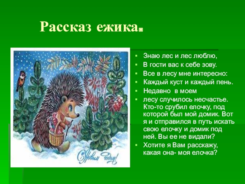 лесу случилось несчастье. Кто-то срубил елочку, под которой был мой домик. Вот я и отправился в путь искать свою елочку и домик под ней. Вы ее не видали?