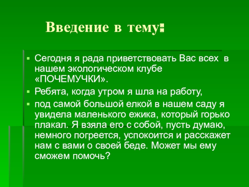 под самой большой елкой в нашем саду я увидела маленького ежика, который горько плакал. Я взяла его с собой, пусть думаю, немного погреется, успокоится и расскажет нам с вами о своей беде. Может мы ему сможем помочь?