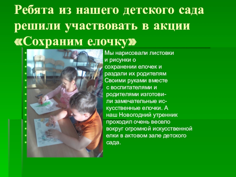 Слайд 27Ребята из нашего детского сада решили участвовать в акции «Сохраним елочку»