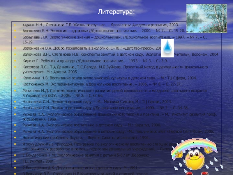 Бобылева Л.К. Экологические знания – дошкольникам. //Дошкольное воспитание. – 1997. – № 7. – С. 16-19.