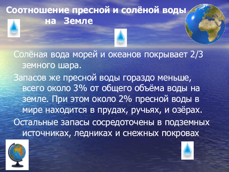 Слайд 4Соотношение пресной и солёной воды