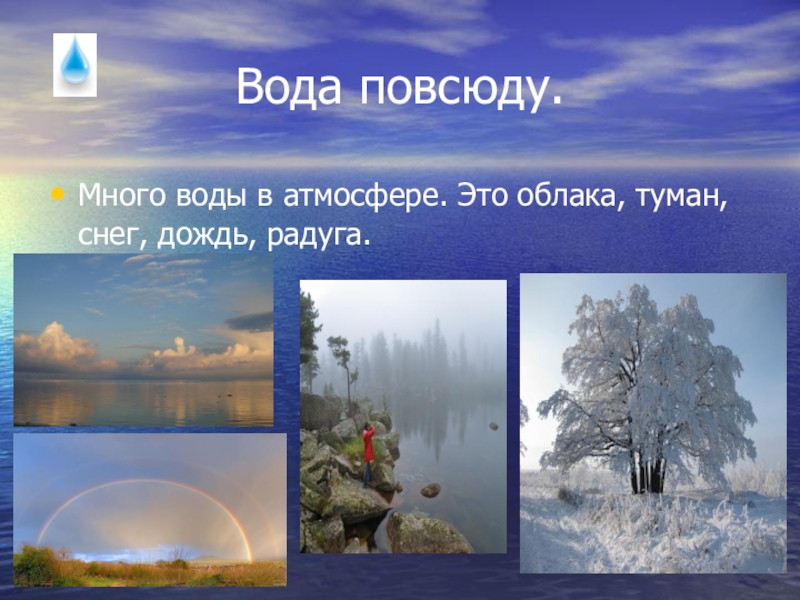 Много воды в атмосфере. Это облака, туман, снег, дождь, радуга.