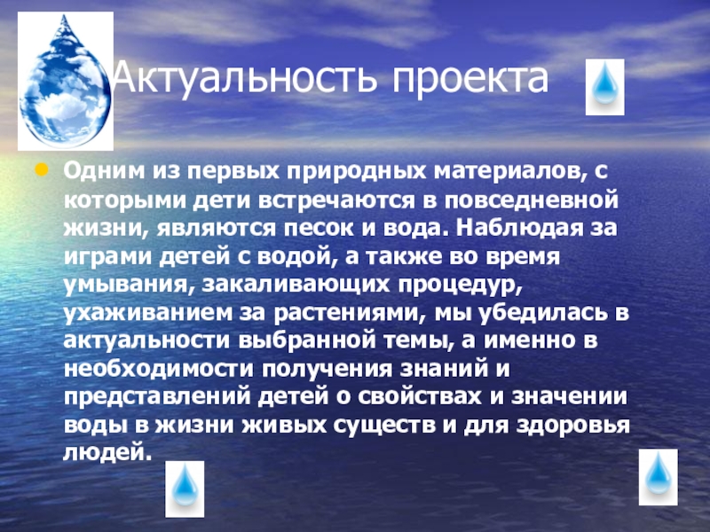 дети встречаются в повседневной жизни, являются песок и вода. Наблюдая за играми детей с водой, а также во время умывания, закаливающих процедур, ухаживанием за растениями, мы убедилась в актуальности выбранной темы, а именно в необходимости получения знаний и представлений детей о свойствах и значении воды в жизни живых существ и для здоровья людей.