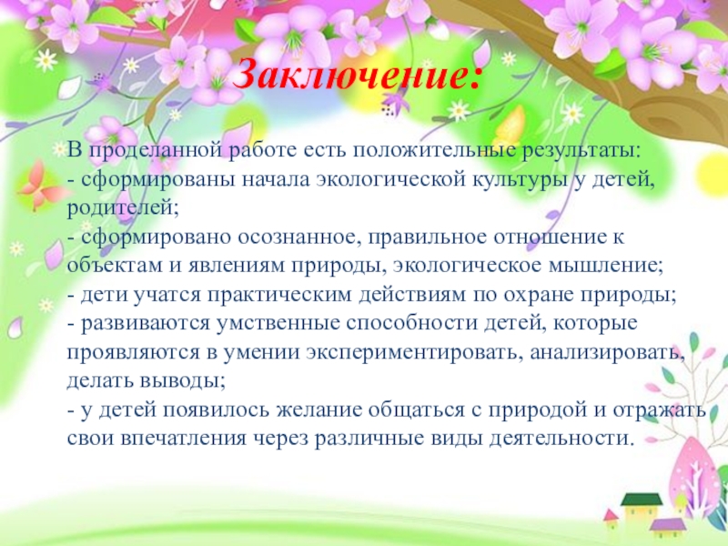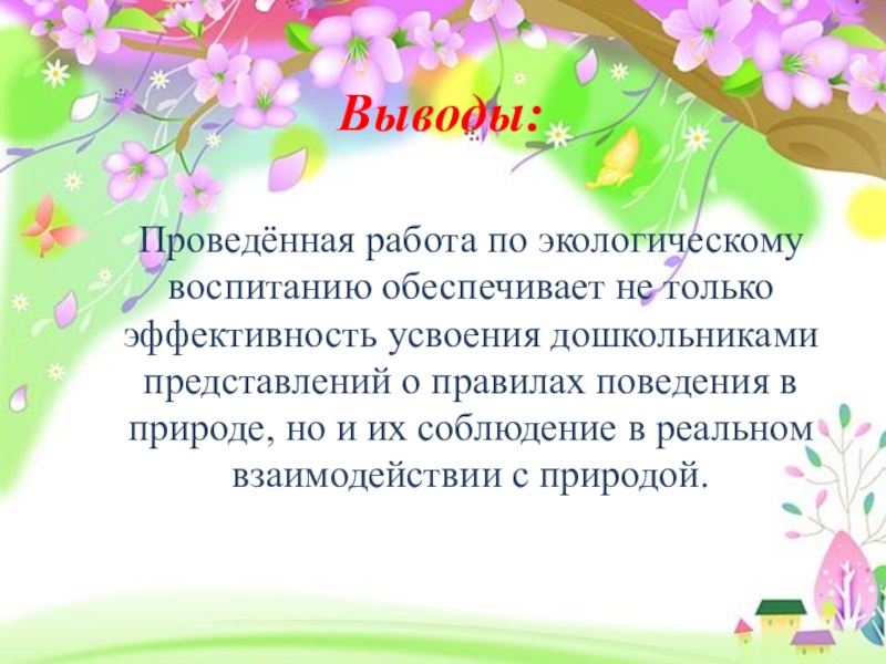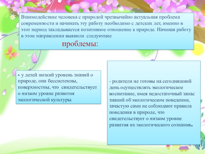 Взаимодействие человека с природой чрезвычайно актуальная проблема современности и начинать эту работу необходимо с детских лет, именно в этот период закладывается позитивное отношение к природе. Начиная работу в этом направлении выявили следующие