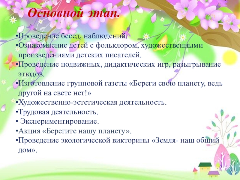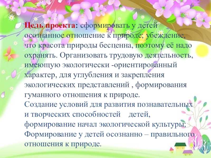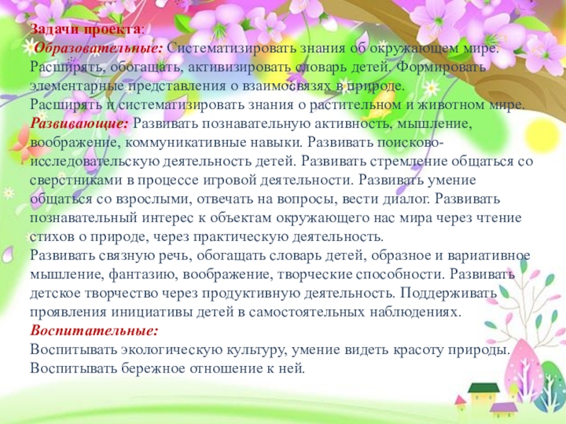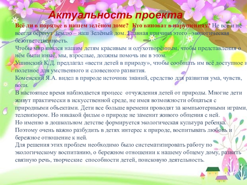Для решения этих проблем необходимо было систематизировать работу по экологическому воспитанию, о бережном отношении к нашему общему дому, развить связную речь, творческие способности детей, поисковую деятельность.