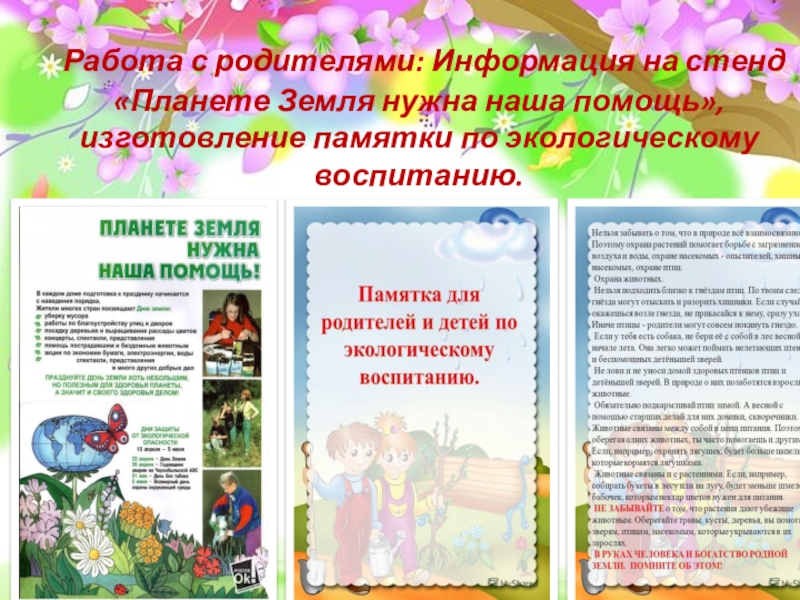 Работа с родителями: Информация на стенд «Планете Земля нужна наша помощь», изготовление памятки по экологическому воспитанию.