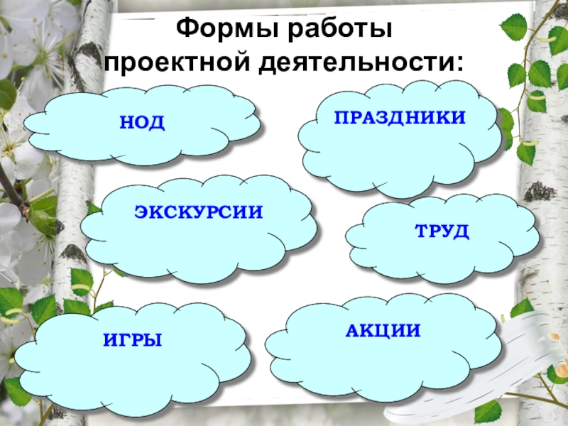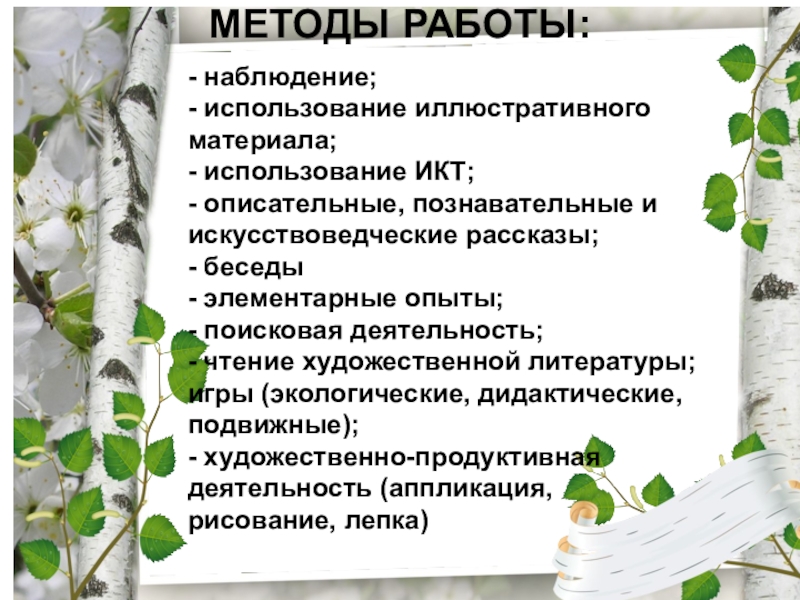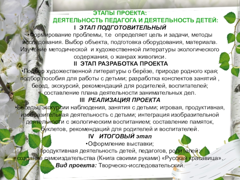 •Подбор художественной литературы о берёзе, природе родного края; подбор пособия для работы с детьми; разработка конспектов занятий , бесед, экскурсий, рекомендаций для родителей, воспитателей; составление плана деятельности занимательных дел.