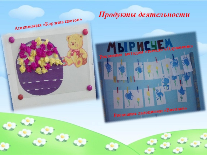 Организация в группе выставки детских работ рисование ладошками «Василек», рисование методом тычка «Одуванчик», аппликация «Корзина цветов»