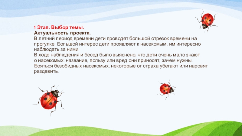 В ходе наблюдения и бесед было выяснено, что дети очень мало знают о насекомых: название, пользу или вред они приносят, зачем нужны.