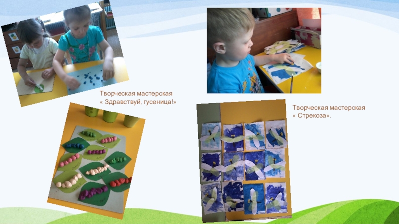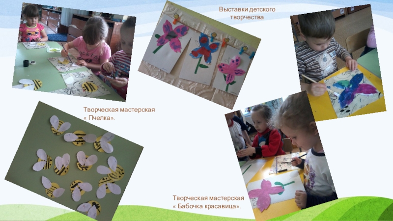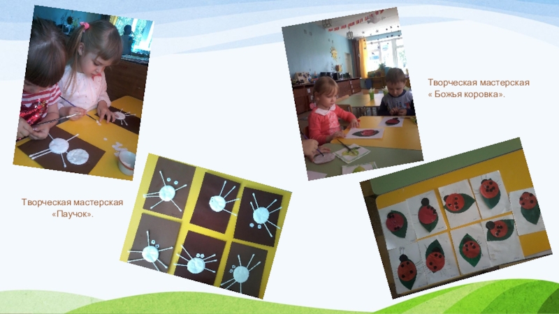 Творческие мастерские: аппликация «Божья коровка», рисунок «Бабочка- красавица», лепка «Здравствуй, гусеница!», аппликация (нетрадиционная техника) «Паучок», аппликация «Пчелка», аппликация «Стрекоза».
