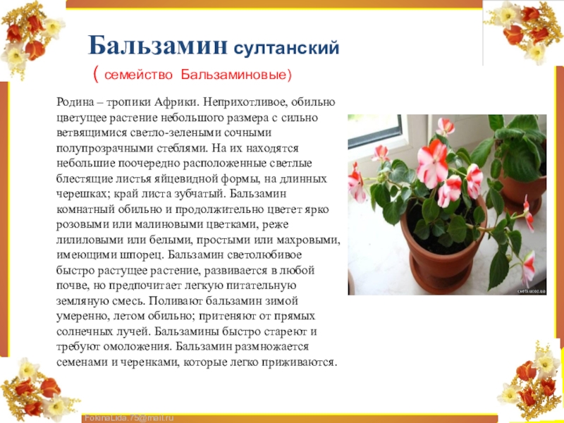 сильно ветвящимися светло-зелеными сочными полупрозрачными стеблями. На их находятся небольшие поочередно расположенные светлые блестящие листья яйцевидной формы, на длинных черешках; край листа зубчатый. Бальзамин комнатный обильно и продолжительно цветет ярко розовыми или малиновыми цветками, реже лилиловыми или белыми, простыми или махровыми, имеющими шпорец. Бальзамин светолюбивое быстро растущее растение, развивается в любой почве, но предпочитает легкую питательную земляную смесь. Поливают бальзамин зимой умеренно, летом обильно; притеняют от прямых солнечных лучей. Бальзамины быстро стареют и требуют омоложения. Бальзамин размножается семенами и черенками, которые легко приживаются.