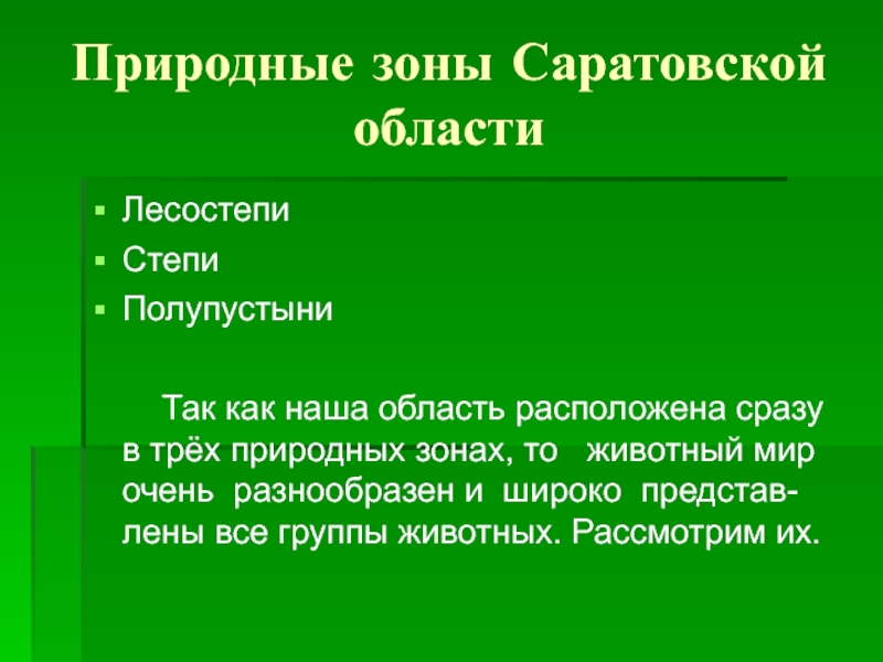 Природные зоны Саратовской областиЛесостепиСтепиПолупустыни Так как наша область расположена сразу в трёх природных зонах, то животный мир очень разнообразен и широко представ-лены все группы животных. Рассмотрим их.