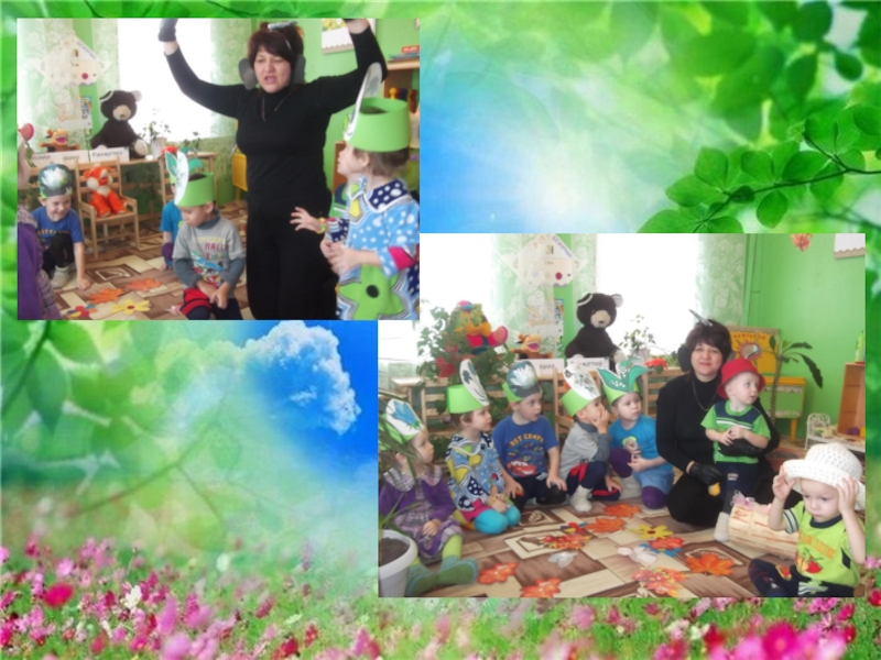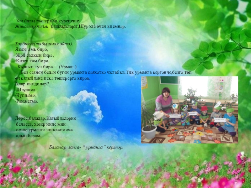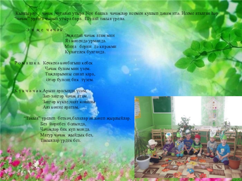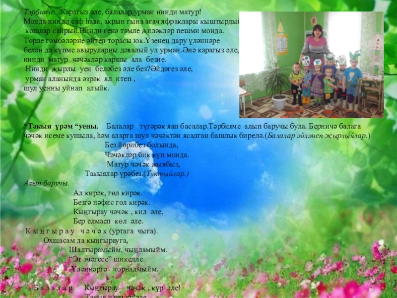 “Тәкыя үрәм “уены. Балалар түгәрәк яап басалар.Тәрбияче алып баручы була. Берничә балага чәчәк исеме кушыла, һәм аларга шул чәчәктән ясалган башлык бирелә.(Балалар әйләнеп җырлыйлар.)