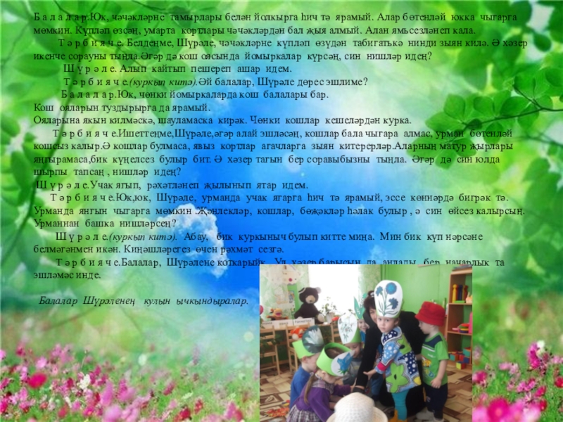 Т ә р б и я ч е. Белдеңме, Шүрәле, чәчәкләрне күпләп өзүдән табигатькә нинди зыян килә. Ә хәзер икенче сорауны тыңла.Әгәр дә кош оясында йомыркалар күрсәң, син нишләр идең?