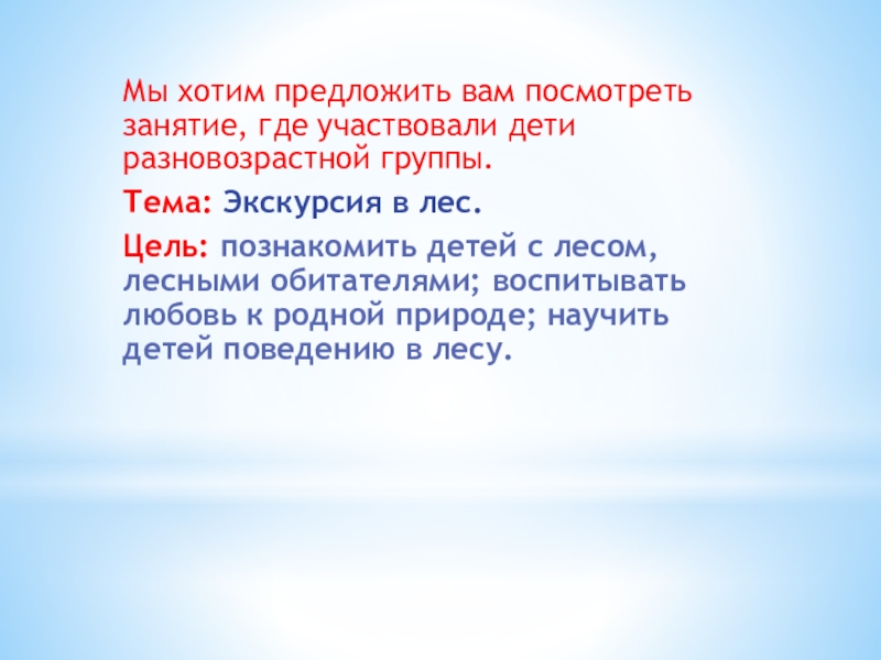 Мы хотим предложить вам посмотреть занятие, где участвовали дети разновозрастной группы.Тема: Экскурсия в лес.Цель: познакомить детей с