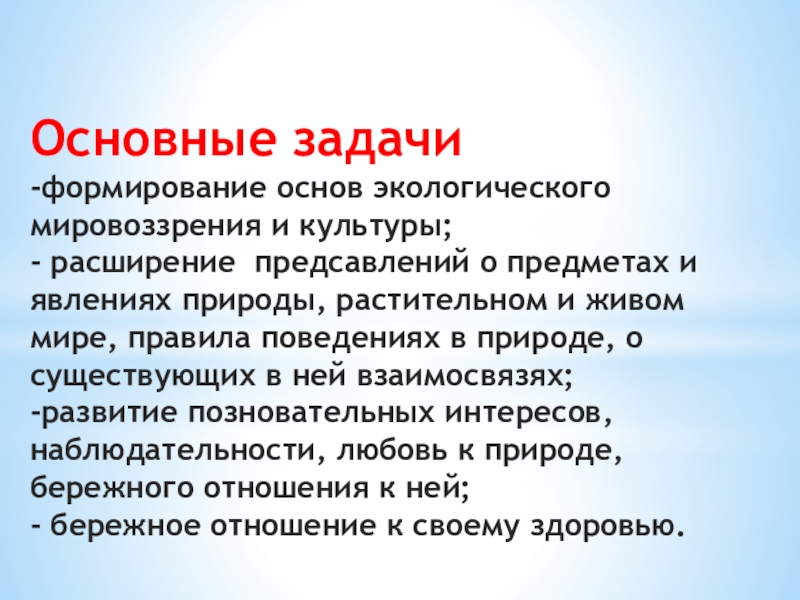 Слайд 3Основные задачи -формирование основ экологического мировоззрения и культуры; - расширение предсавлений о предметах