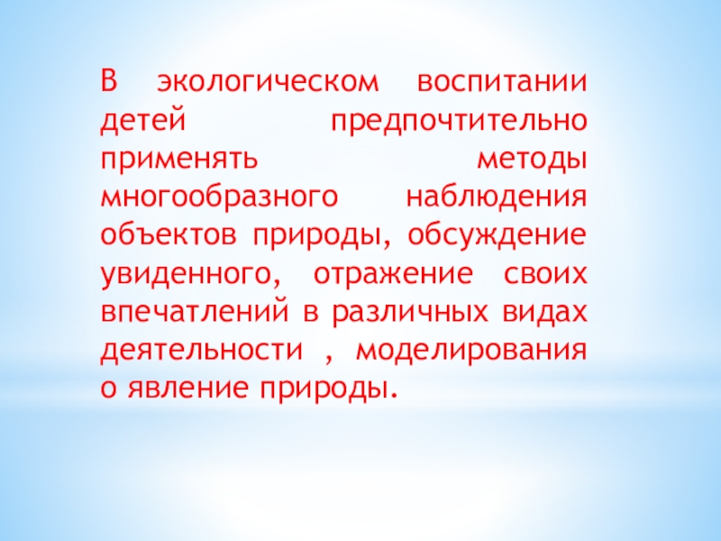 Слайд 5В экологическом воспитании детей предпочтительно применять методы многообразного наблюдения объектов природы,