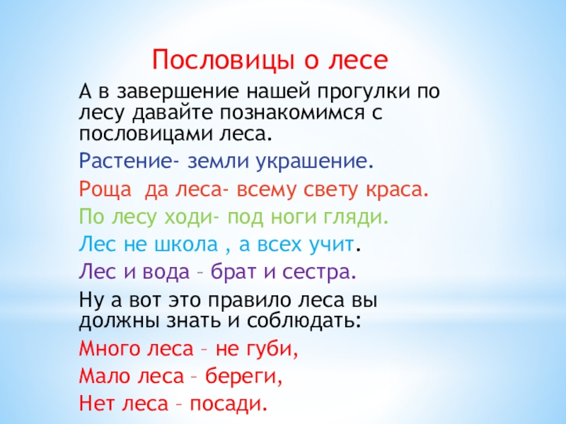 Пословицы о лесеА в завершение нашей прогулки по лесу давайте познакомимся с пословицами леса.Растение- земли украшение.Роща да