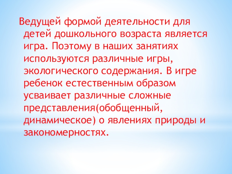 Ведущей формой деятельности для детей дошкольного возраста является игра. Поэтому в наших занятиях используются различные игры, экологического
