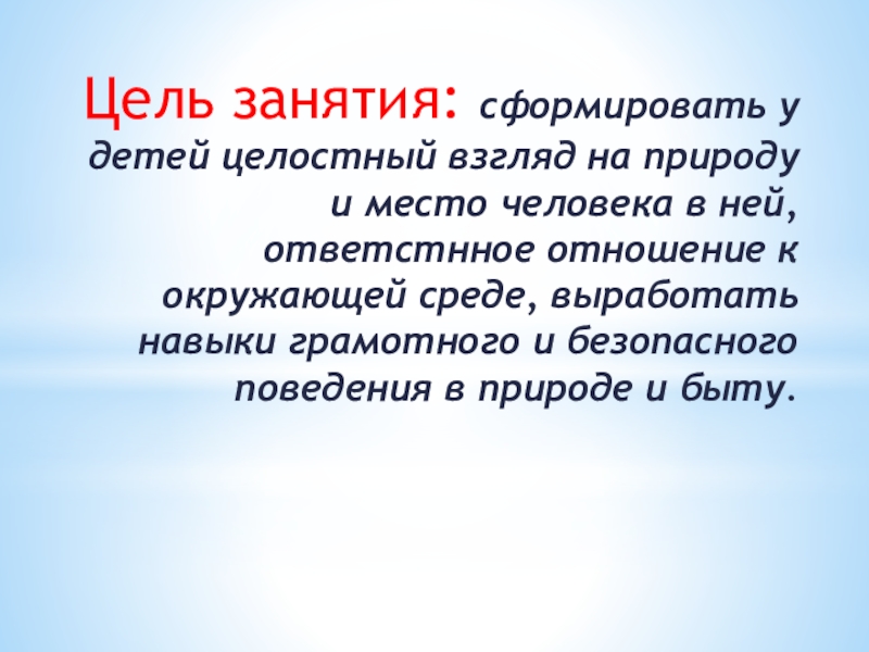 Цель занятия: сформировать у детей целостный взгляд на природу и место человека в ней, ответстнное отношение к окружающей среде, выработать навыки грамотного и безопасного поведения в природе и быту.