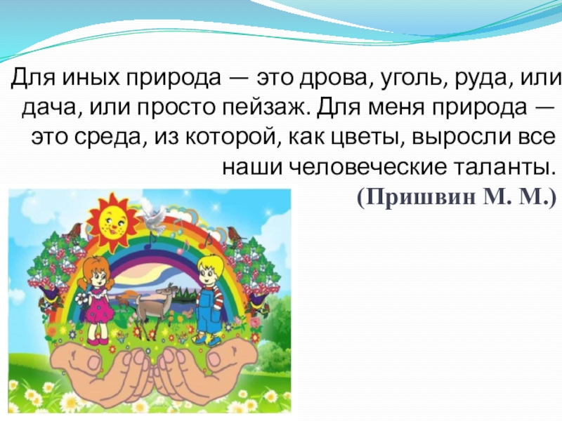 Для иных природа — это дрова, уголь, руда, или дача, или просто пейзаж. Для меня природа — это среда, из которой, как цветы, выросли все наши человеческие таланты.                          (Пришвин М. М.)