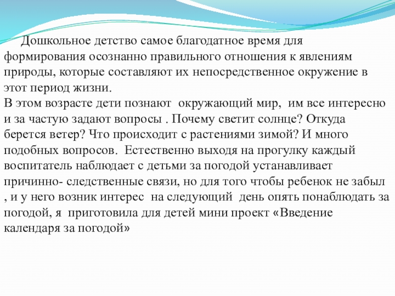 В этом возрасте дети познают окружающий мир, им все интересно и за частую задают вопросы . Почему светит солнце? Откуда берется ветер? Что происходит с растениями зимой? И много подобных вопросов. Естественно выходя на прогулку каждый воспитатель наблюдает с детьми за погодой устанавливает причинно- следственные связи, но для того чтобы ребенок не забыл , и у него возник интерес на следующий день опять понаблюдать за погодой, я приготовила для детей мини проект «Введение календаря за погодой»