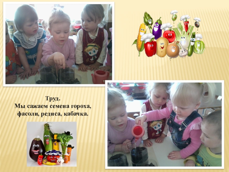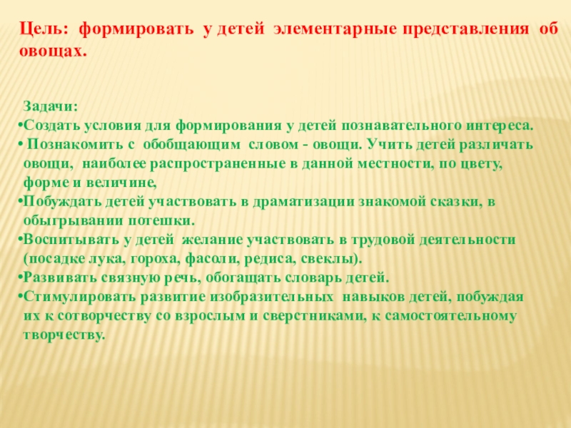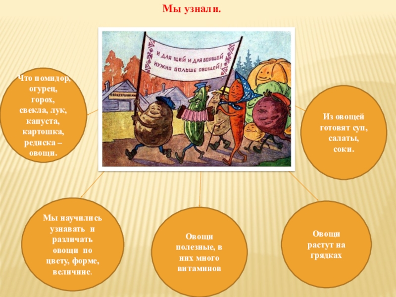 Мы научились узнавать и различать овощи по цвету, форме, величине.