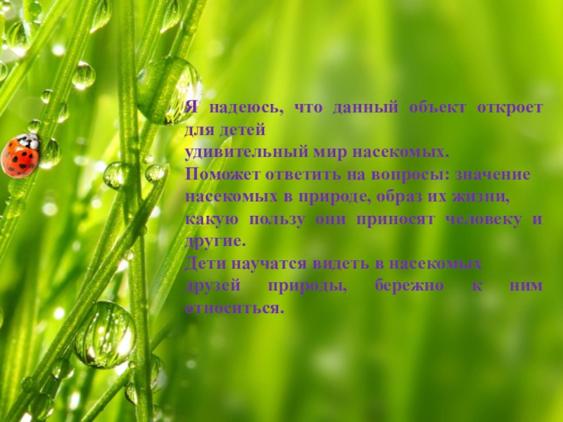 Я надеюсь, что данный объект откроет для детей удивительный мир насекомых. Поможет ответить на вопросы: значение насекомых