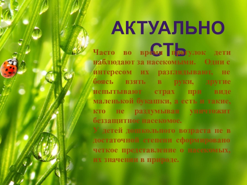 АКТУАЛЬНОСТЬЧасто во время прогулок дети наблюдают за насекомыми.  Одни с интересом их разглядывают, не боясь взять