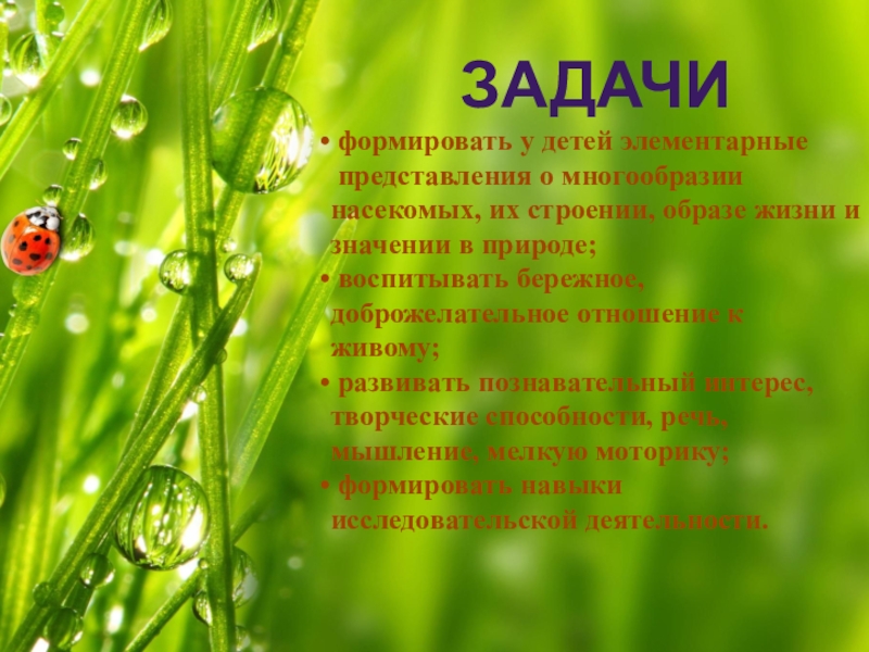 Задачи формировать у детей элементарные представления о многообразии насекомых, их строении, образе жизни и значении в природе;