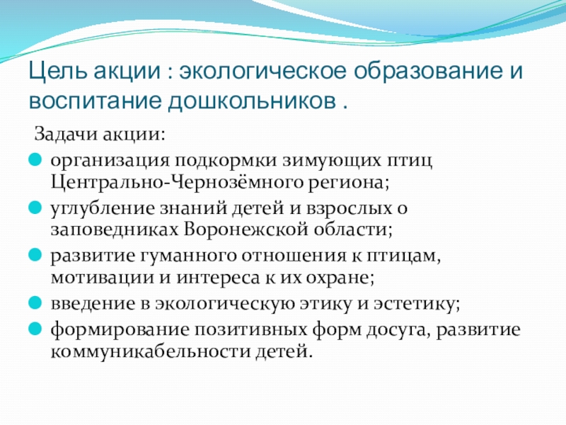 Цель акции : экологическое образование и воспитание дошкольников .Задачи акции:организация подкормки зимующих птиц Центрально-Чернозёмного региона;углубление знаний детей и взрослых о заповедниках Воронежской области; развитие гуманного отношения к птицам, мотивации и интереса к их охране;введение в экологическую