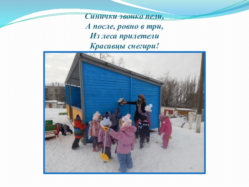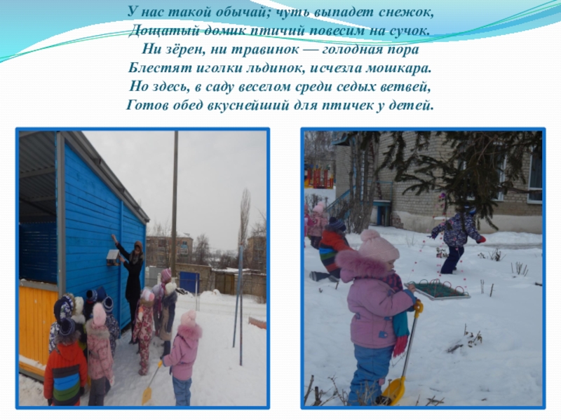 Слайд 7У нас такой обычай; чуть выпадет снежок, Дощатый домик птичий повесим