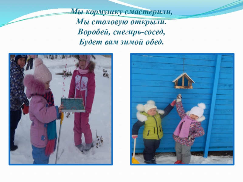 Мы кормушку смастерили, Мы столовую открыли. Воробей, снегирь-сосед, Будет вам зимой обед.