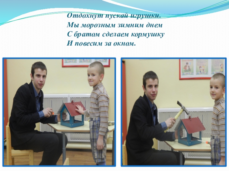 Слайд 3 Отдохнут пускай игрушки. Мы морозным зимним днем С братом сделаем кормушку И повесим за