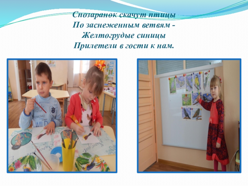 Спозаранок скачут птицы  По заснеженным ветвям -  Желтогрудые синицы Прилетели в гости к нам.
