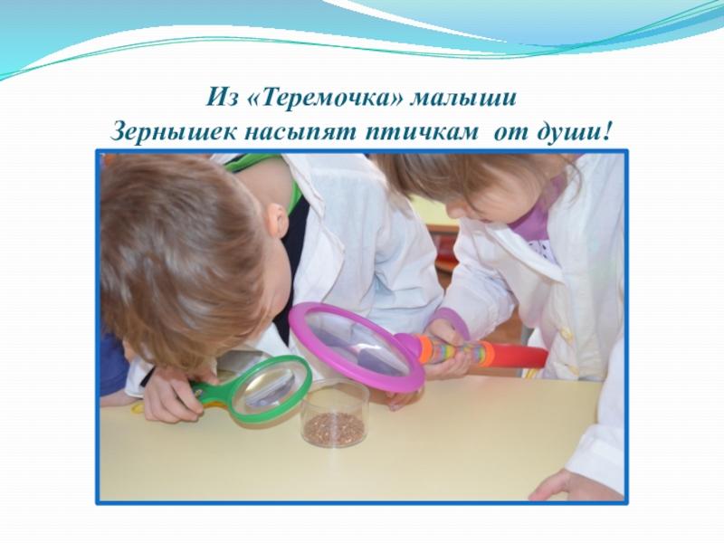 Слайд 5Из «Теремочка» малыши Зернышек насыпят птичкам от души!