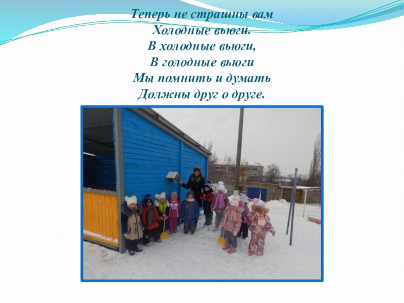 Слайд 9 Теперь не страшны вам Холодные вьюги. В холодные вьюги, В голодные вьюги Мы помнить и