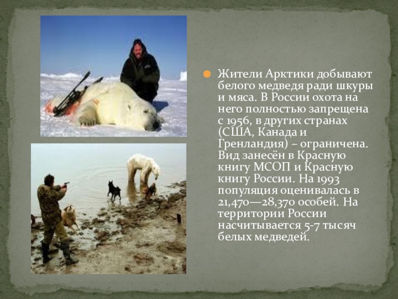 Слайд 18Жители Арктики добывают белого медведя ради шкуры и мяса. В России