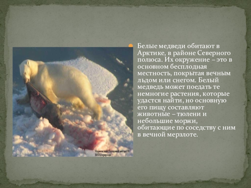Слайд 15Белые медведи обитают в Арктике, в районе Северного полюса. Их окружение