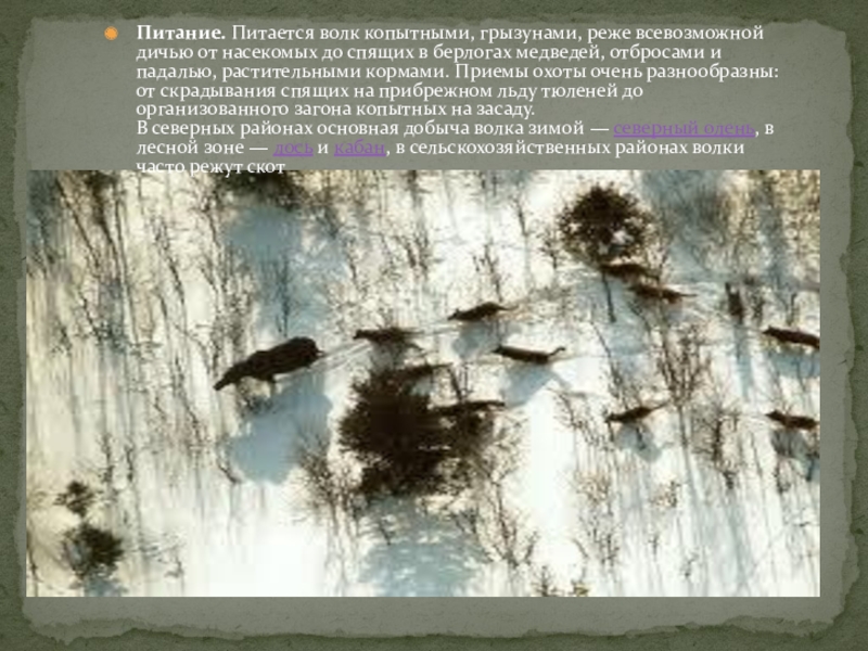 Слайд 9Питание. Питается волк копытными, грызунами, реже всевозможной дичью от насекомых до спящих