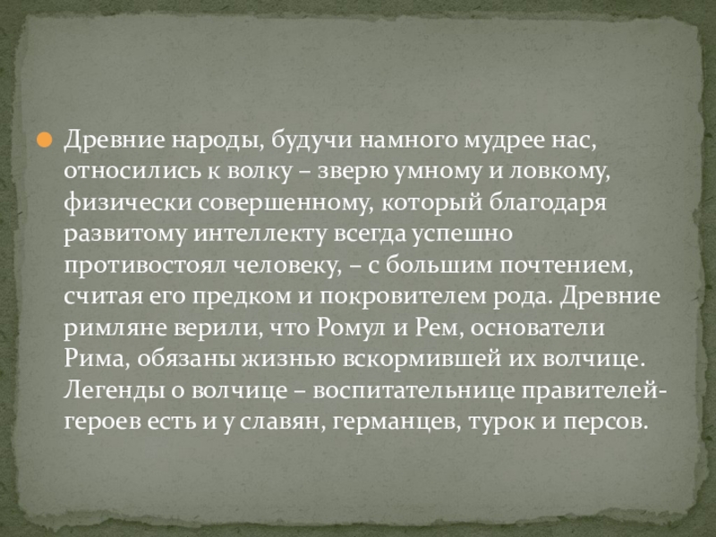 Слайд 6Древние народы, будучи намного мудрее нас, относились к волку – зверю